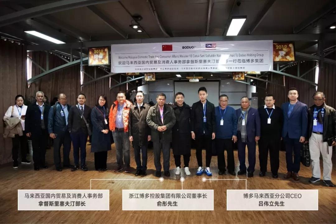 当天,马来西亚国内贸易及消费人事务部拿督斯里赛夫汀部长等一行30多位海外政府官员莅临博多集团。博多集团董事长余彤先生,博多马来西亚分公司CEO吕伟立先生(Bryan Loo)共同出席了本次会议,并亲切接见了马来西亚部长及官员。